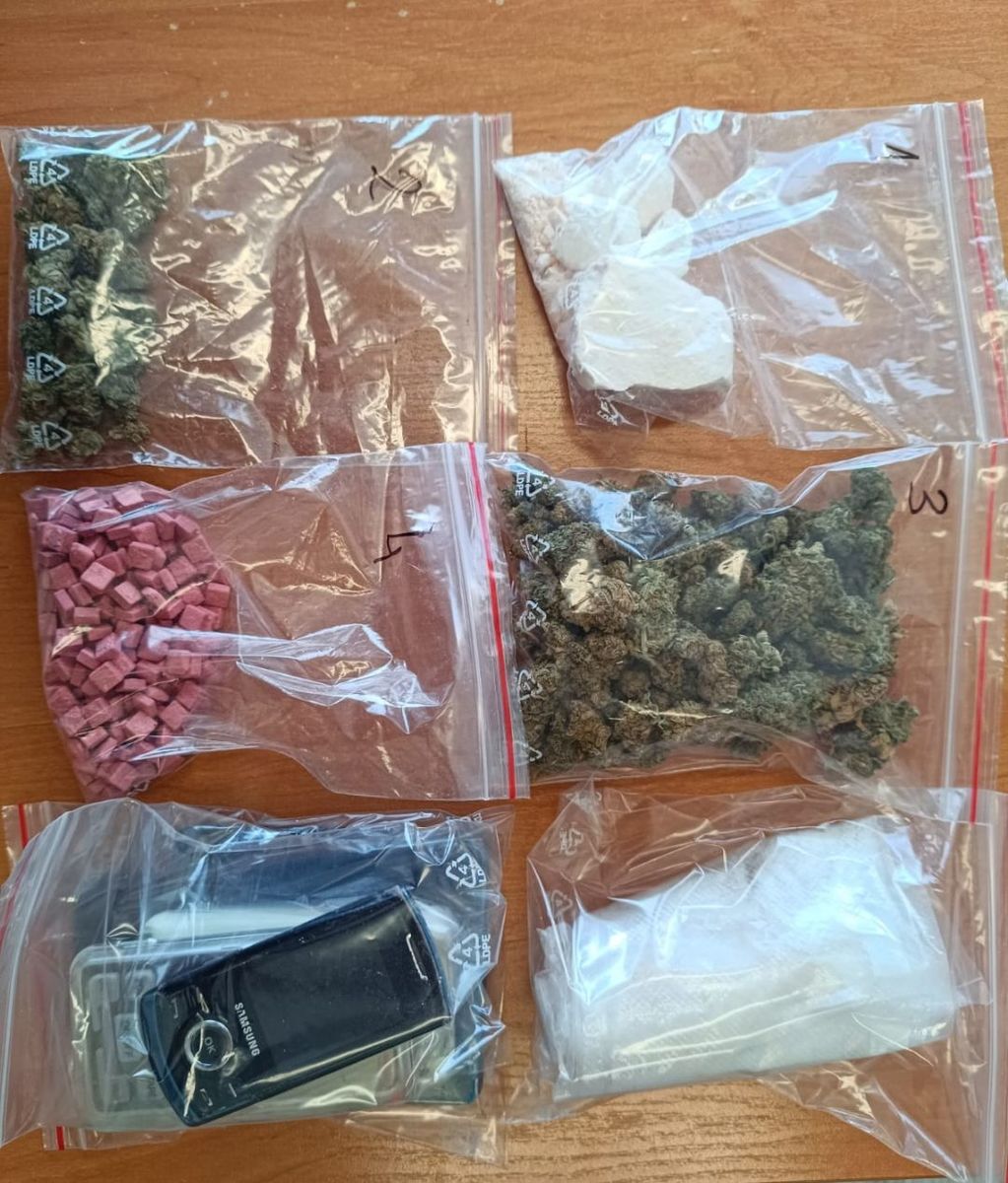 Podczas interwencji 36-letni mężczyzna zachowywał się w sposób nienaturalny i nerwowy, co wzbudziło podejrzenia policjantów. W trakcie sprawdzenia pomieszczeń ujawnili oni worek foliowy z podejrzanymi substancjami, który był ukryty w szafce. Jak się okazało , znajdowały się w worku tabletki koloru różowego, biały proszek oraz susz roślinny. Wstępne badania potwierdziły ,ze zabezpieczone substancje to amfetamina, marihuana oraz tabletki niewiadomego pochodzenia. Łącznie policjanci zabezpieczyli 211 g narkotyków oraz 112 sztuk tabletek.